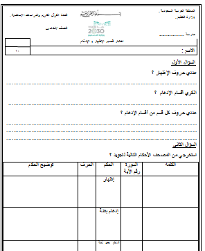 اختبار قصير لمادة التجويد الاظهار و الادغام بصيغة الوورد لتعديل